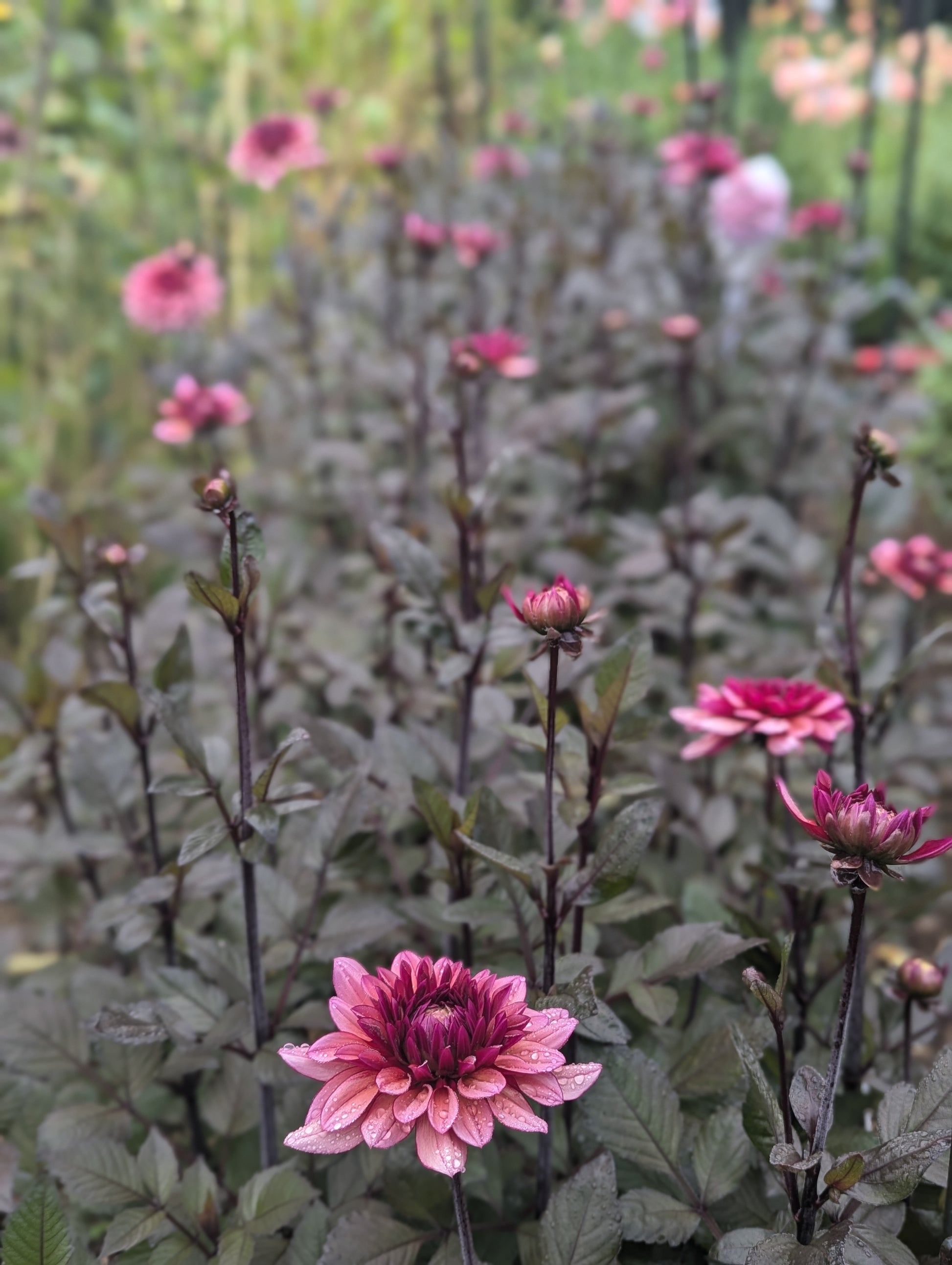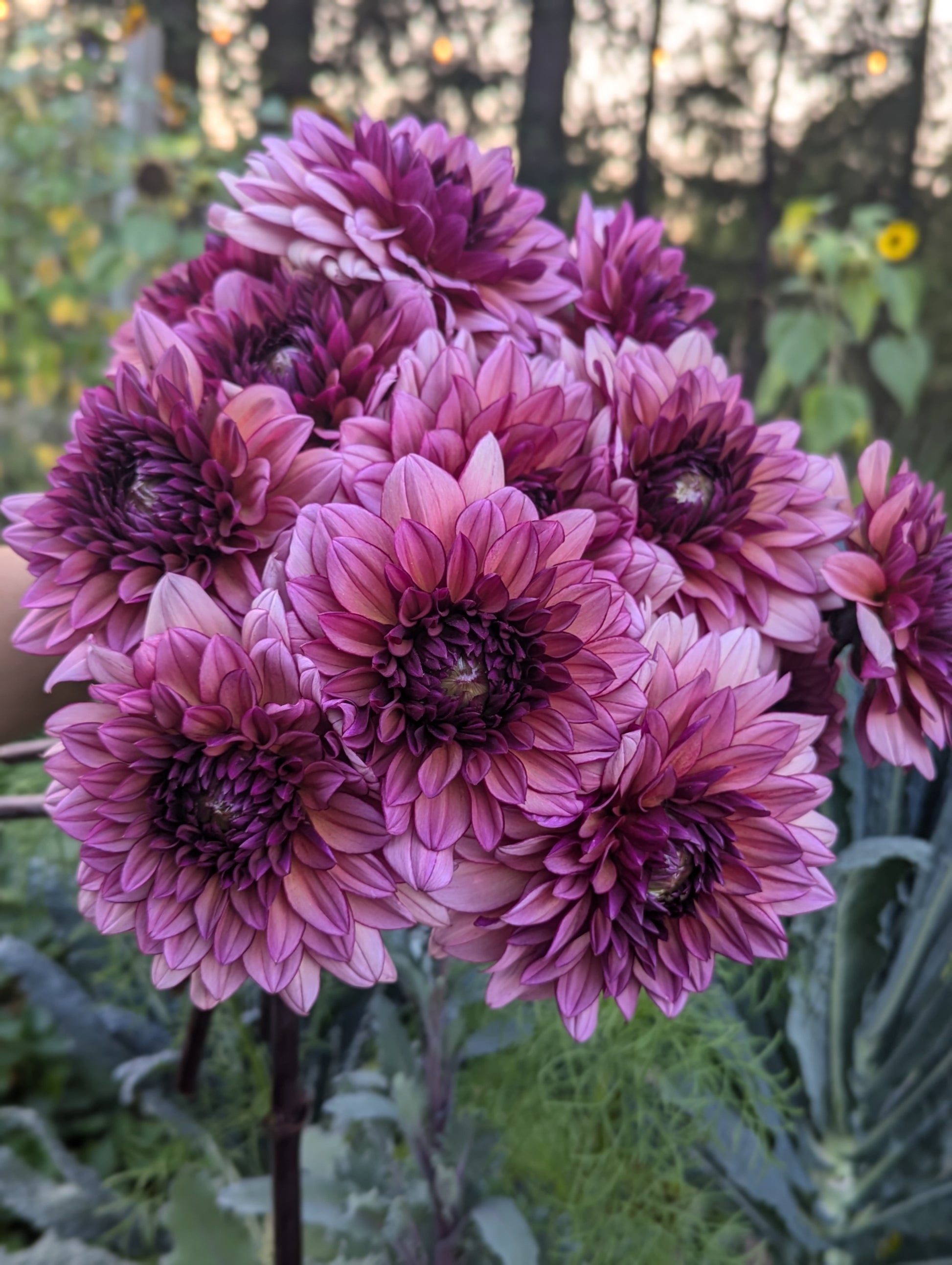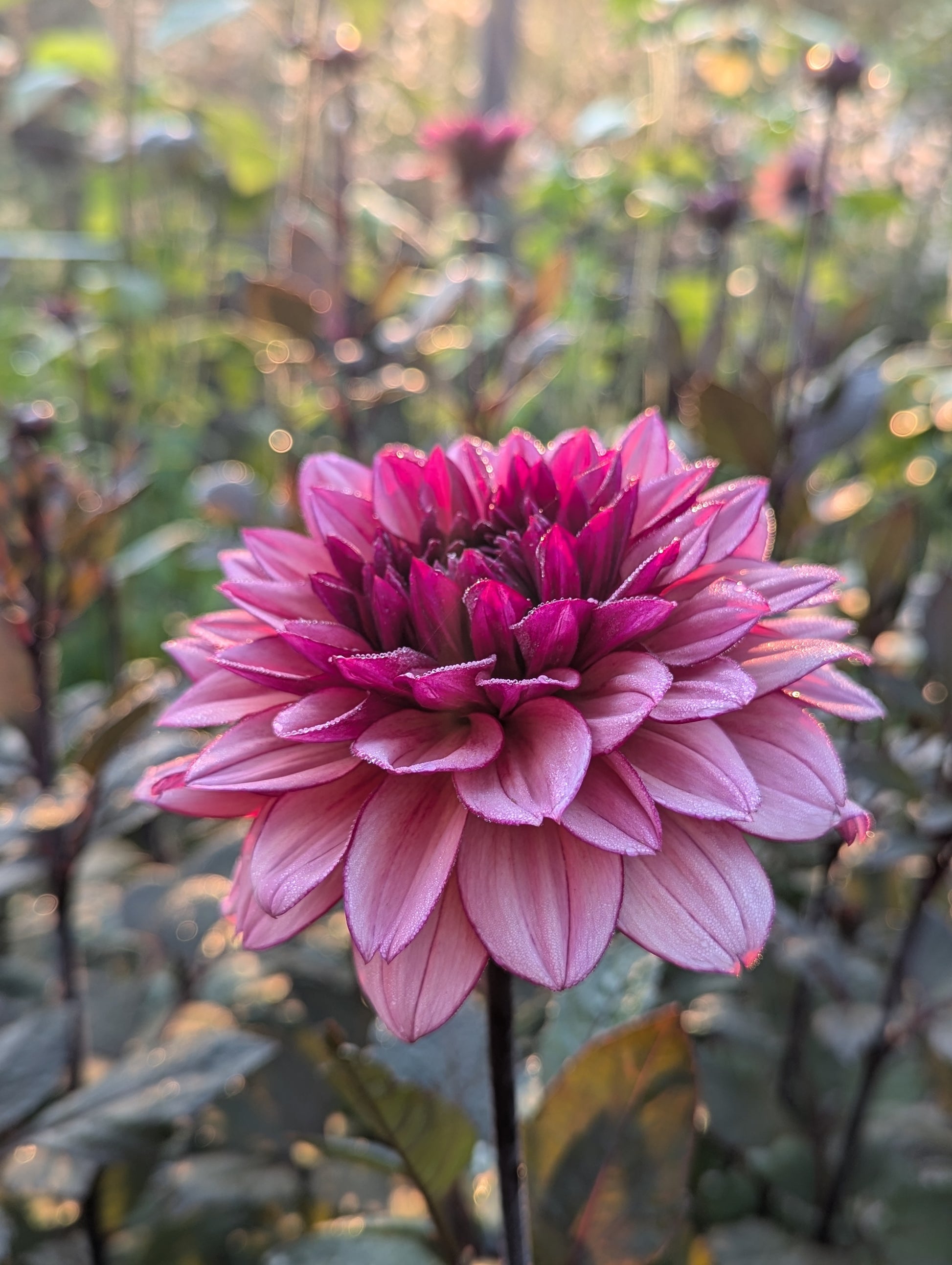 Molly Raven is hard to describe. A glowing 4" raspberry pink decorative bloom that ages to a light raspberry-coffee color. Very dimensional. The blooms truly do glow atop their contrasting sturdy, dark stems and foliage on a plant that topped out around 4' in our field. Molly fit excellently in to many floral arrangements palettes and served as an excellent bridge between color families as well as the perfect choice to transition from summer to fall.